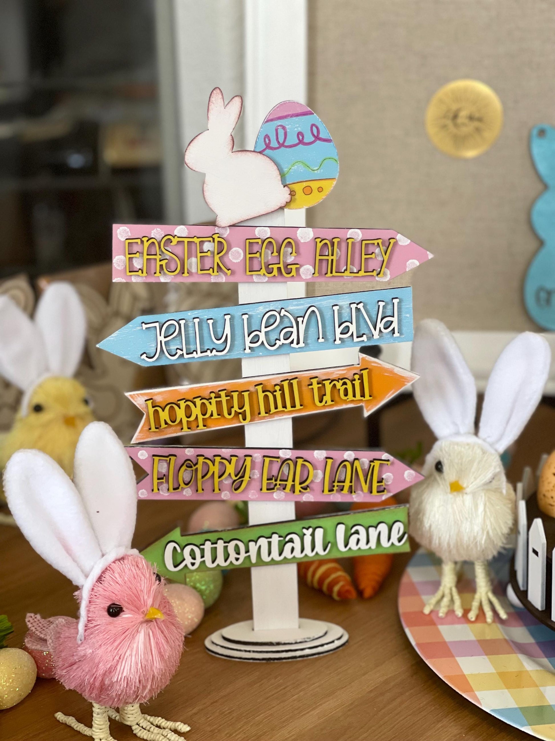 Topped with a cute bunny silhouette and a painted pastel Easter egg, this sign is the perfect addition to your entryway, fireplace mantel, tiered tray, or kids’ Easter party display. Each arrow is painted in festive spring colors with charming polka dots and playful fonts for that magical Easter village vibe.