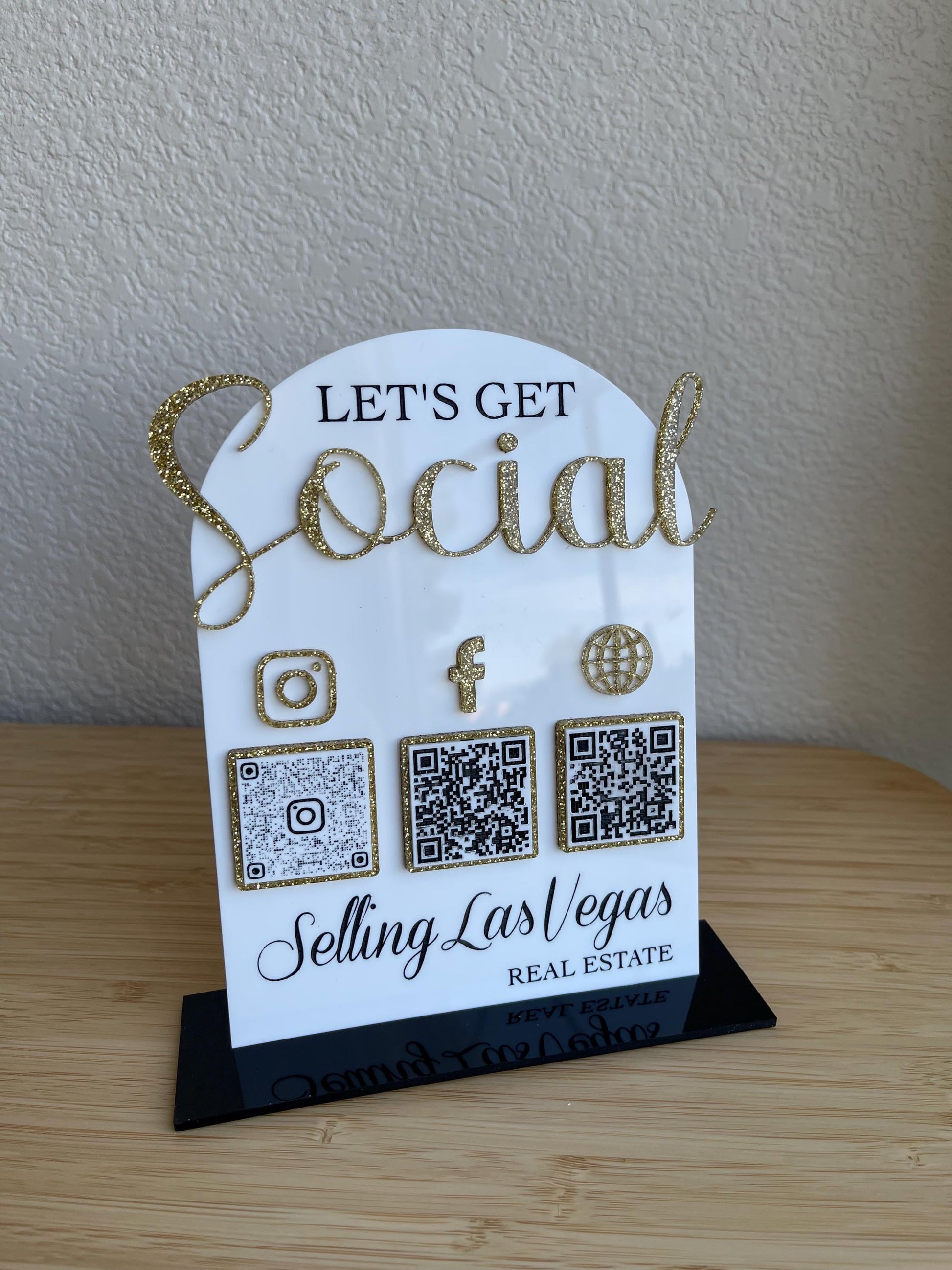 Elevate your brand presence with our stylish “Let’s Get Social” acrylic business sign, perfect for Realtors, Small Business Owners, boutiques,Tanning salons, Tattoo Parlors, Art Studios, Fitness/Wellness Spas, Hair/Nail Salons, Lash Lounges, at your desk or at your vendor booths! This eye-catching display features up to three custom QR codes for your Instagram, Facebook, and website, making it easy for customers to connect with you on the spot! Handmade to order. Please allow 3–5 business days for creation before shipping.
