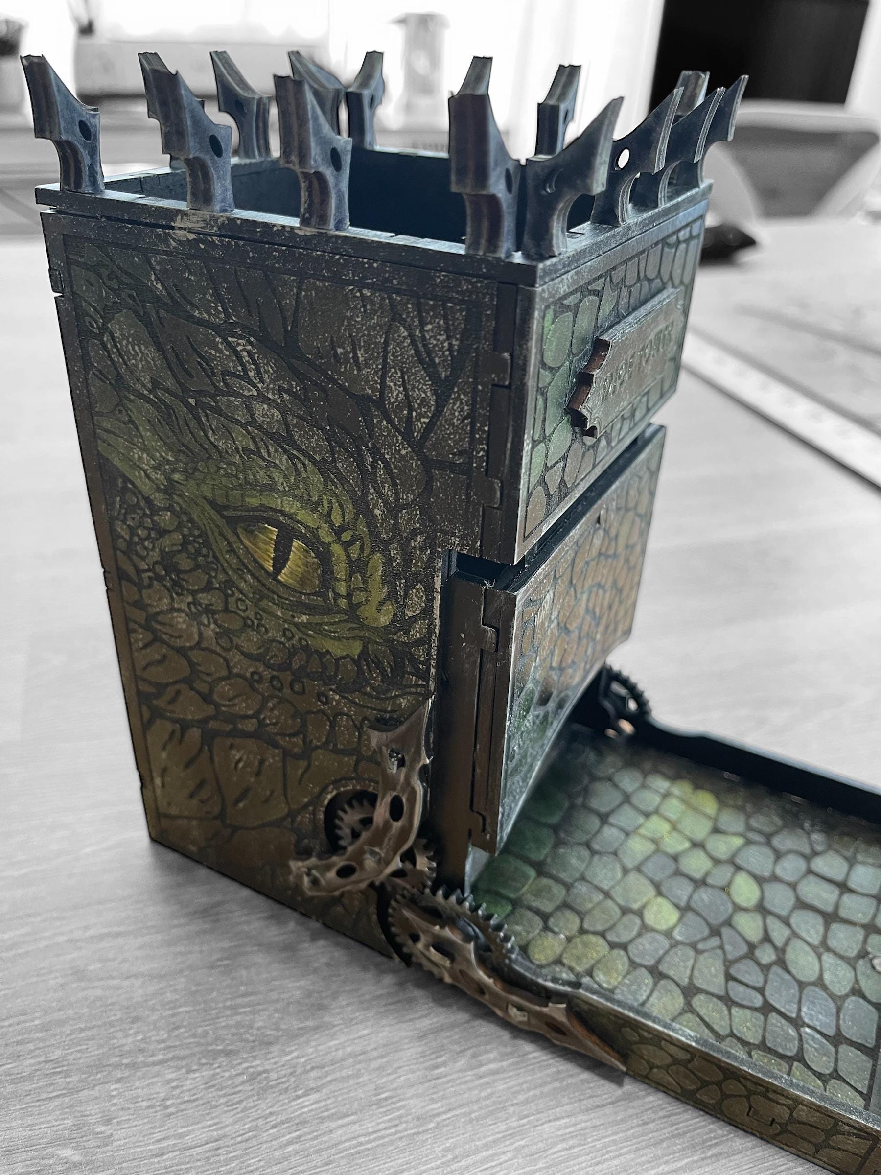 Immerse yourself in the thrill of your favorite tabletop games with this dragon themed dice tower! This handcrafted tower features a fierce dragon eye, scaly textures, and intricate steampunk gears that will captivate any fantasy lover. Designed to combine aesthetics and functionality, this dice tower is perfect for tabletop RPG enthusiasts looking to enhance their gaming experience.