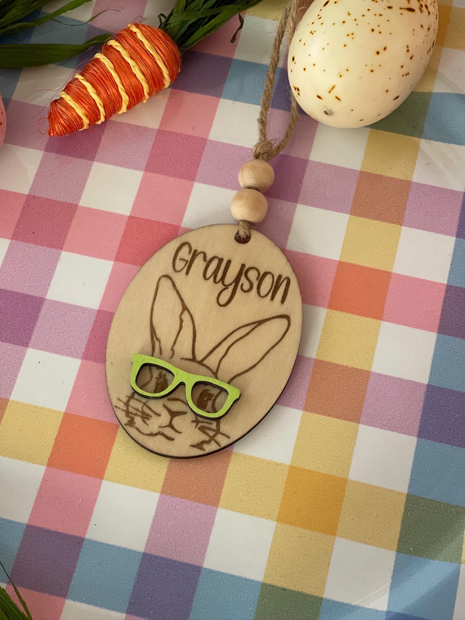 Each tag features an adorable bunny design, customized with a name of your choice, and accented with fun accessories like colorful glasses or a bow (optional). Made from high-quality wood, these durable keepsakes can be used year after year!
