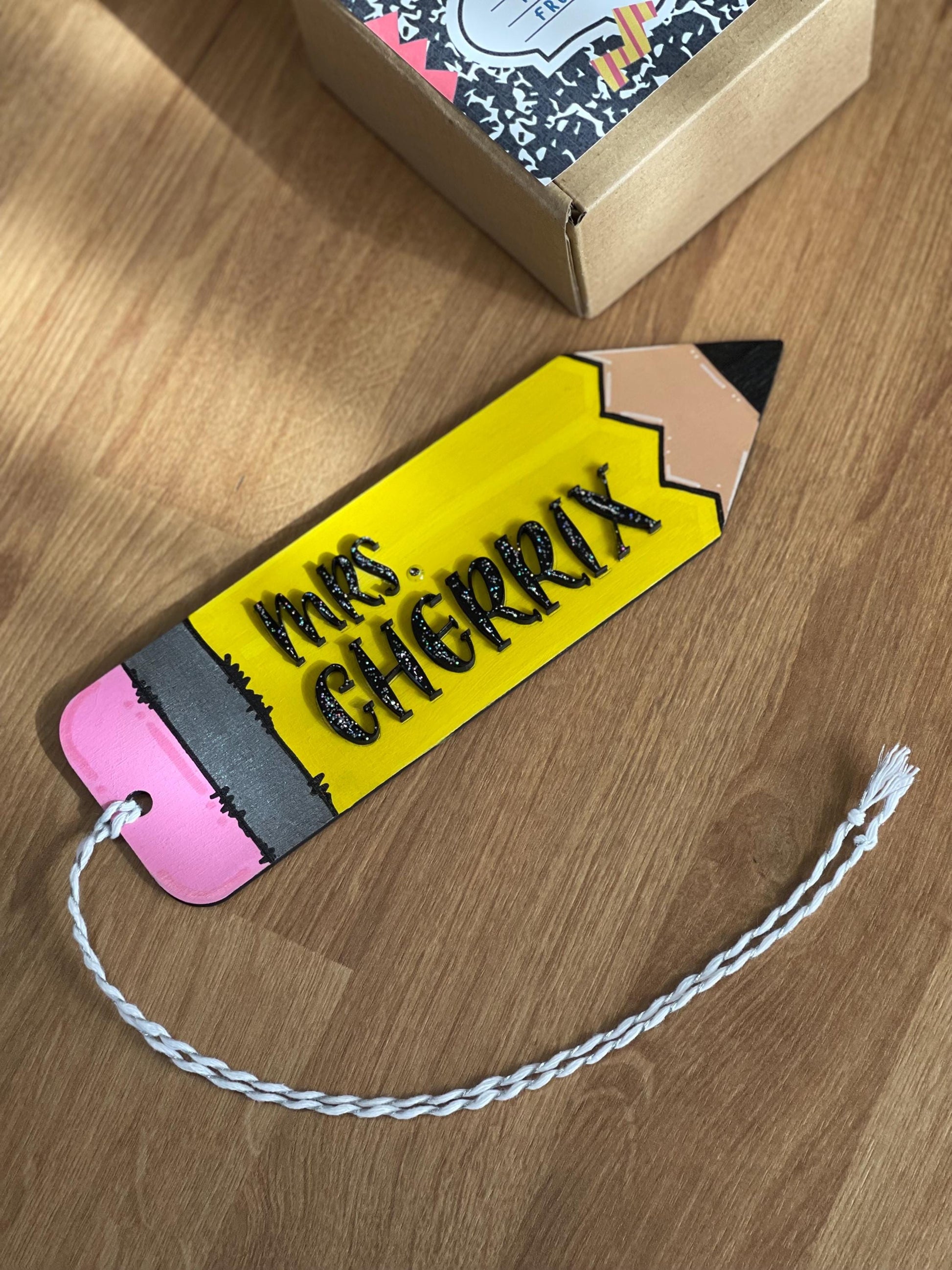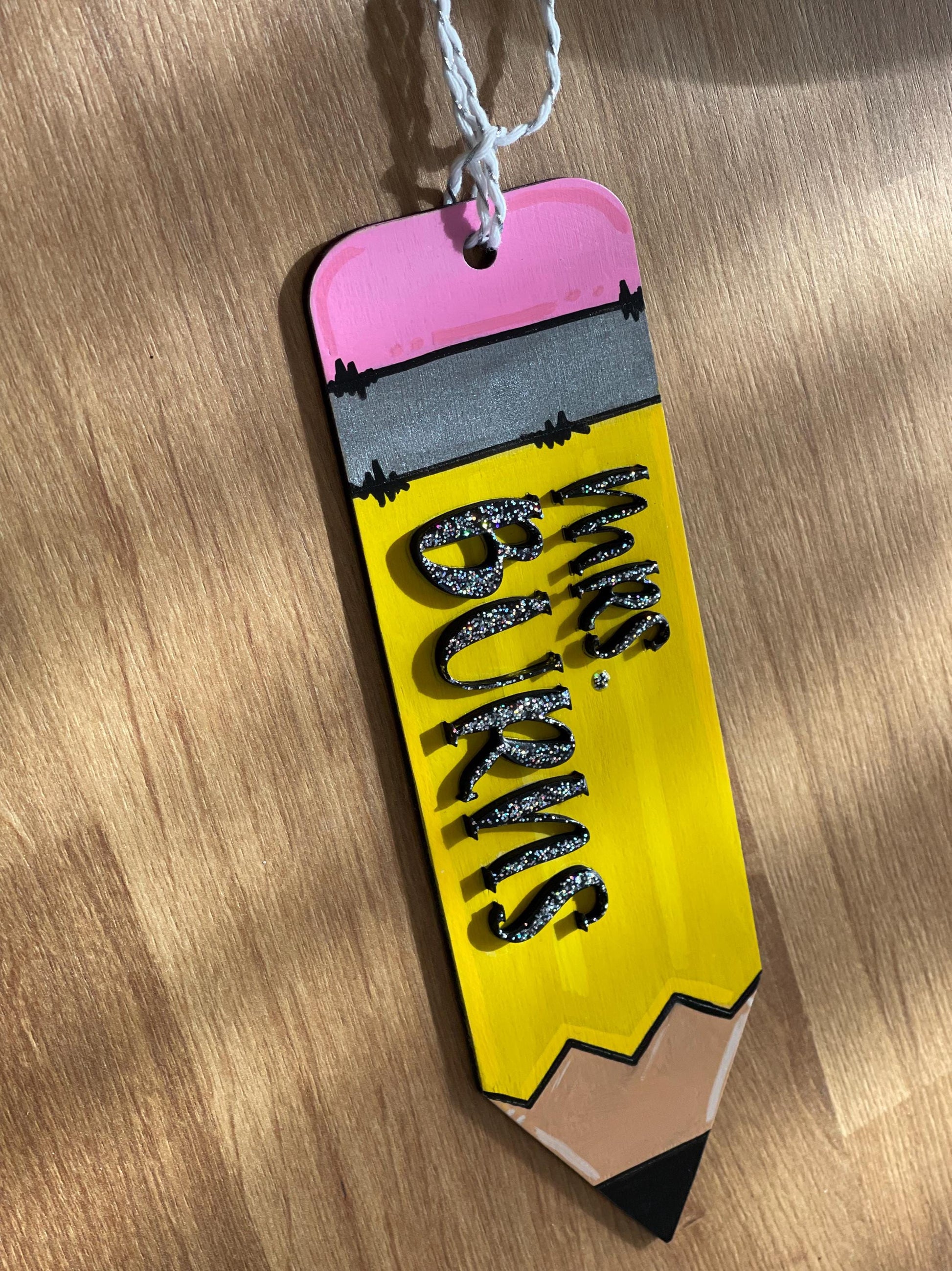 Brighten up your classroom with this charming glittered name pencil sign! Made from laser cut wood and hand painted with resin details. This cute and functional sign can be customized with any name or label. Measuring 2.5” x 8” It’s perfect as a hall pass, bathroom pass, chore board tag, or classroom decor. This lightweight sign comes ready to use or hang with twine for easy hanging. Whether you’re decorating your space or giving a thoughtful teacher gift, this pencil shaped sign is sure to stand out!